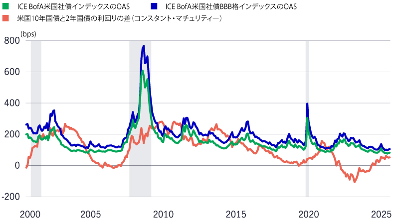 出所:ブルームバーグ、全米経済研究所、2025年11月28日現在。OASはオプション調整後スプレッドを意味します。インデックスの定義は本稿末尾をご参照ください。指数に直接投資することはできません。