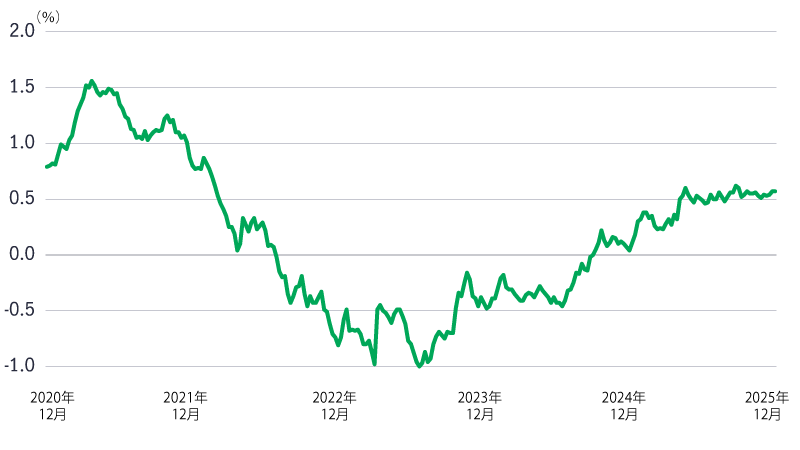 出所:セントルイス連銀、2025年12月5日現在。マイナスの値は逆イールドを意味し、プラスの値は大きいほどスティープ化の程度が大きいことを意味します。
